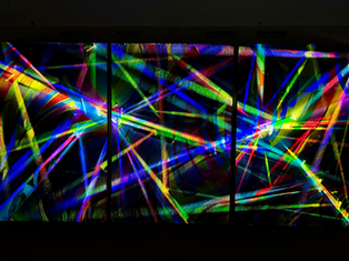 These are individual wall pieces created with colored high-tech optical filters and LED spotlights, mounted on painted boards. Some are single pieces and others consist of multiple boards. For proper viewing they should be seen in a darkened space. Please inquire as to availability and price.